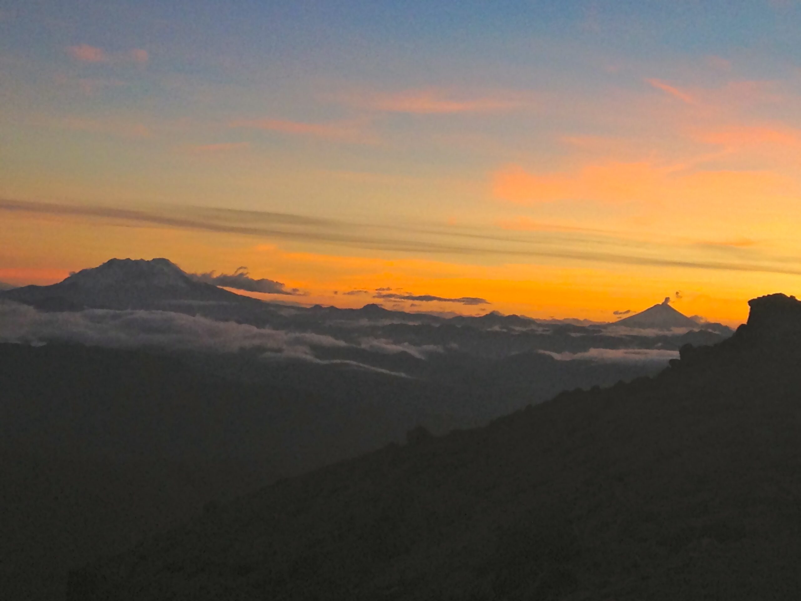 Robyn and I went back to Cayambe a week later to try again. This time we had a poor weather window and decided not to make a summit attempt because of excessive cloud cover. However, we did get to experience a beautiful sunset with Volcano Cotopaxi erupting in the distance.