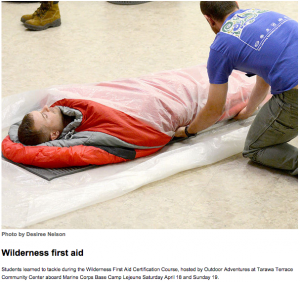 “Students learned to tackle during the Wilderness First Aid Certification Course, hosted by Outdoor Adventures at Tarawa Terrace Community Center aboard Marine Corps Base Camp Lejeune.”